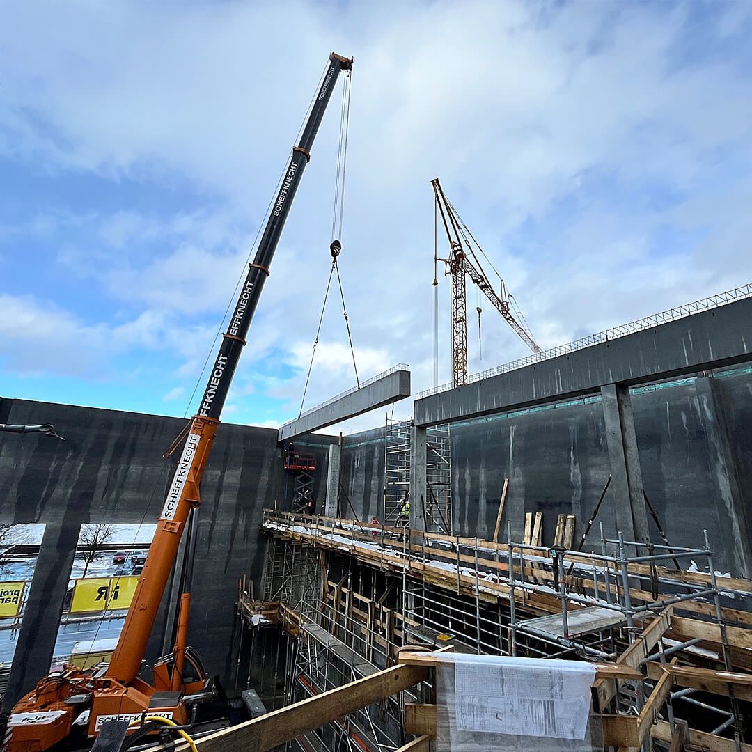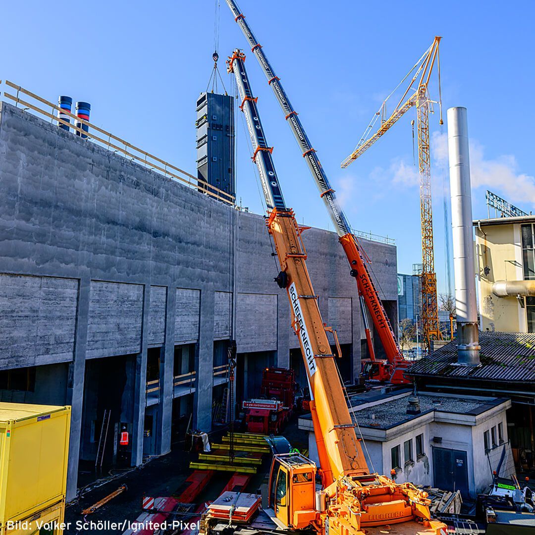 Seit Mitte Januar sind fortlaufend zwischen ein und drei Krane von Scheffknecht auf der Baustelle im Einsatz. Die Aufgaben reichen von kleineren Hebungen und Montageunterstützungen bis hin zu komplexen Schwerlasthüben.
