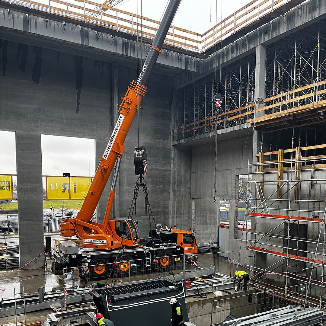 Best Practice Kranlogistik: Scheffknecht Autokran beim Bau der Energiezentrale Ilg in Dornbirn Wallenmahd