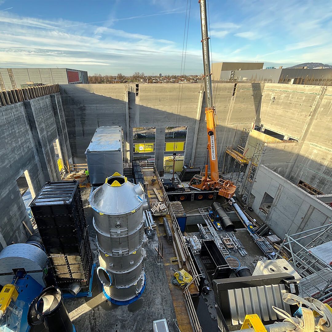 Von der Pfahlgründung bis zur Montage der Verbrennungsanlage: Die neue Energiezentrale Ilg in Dornbirn Wallenmahd ist ein Projekt, in dem sich viele Stärken von Scheffknecht Autokran bündeln: